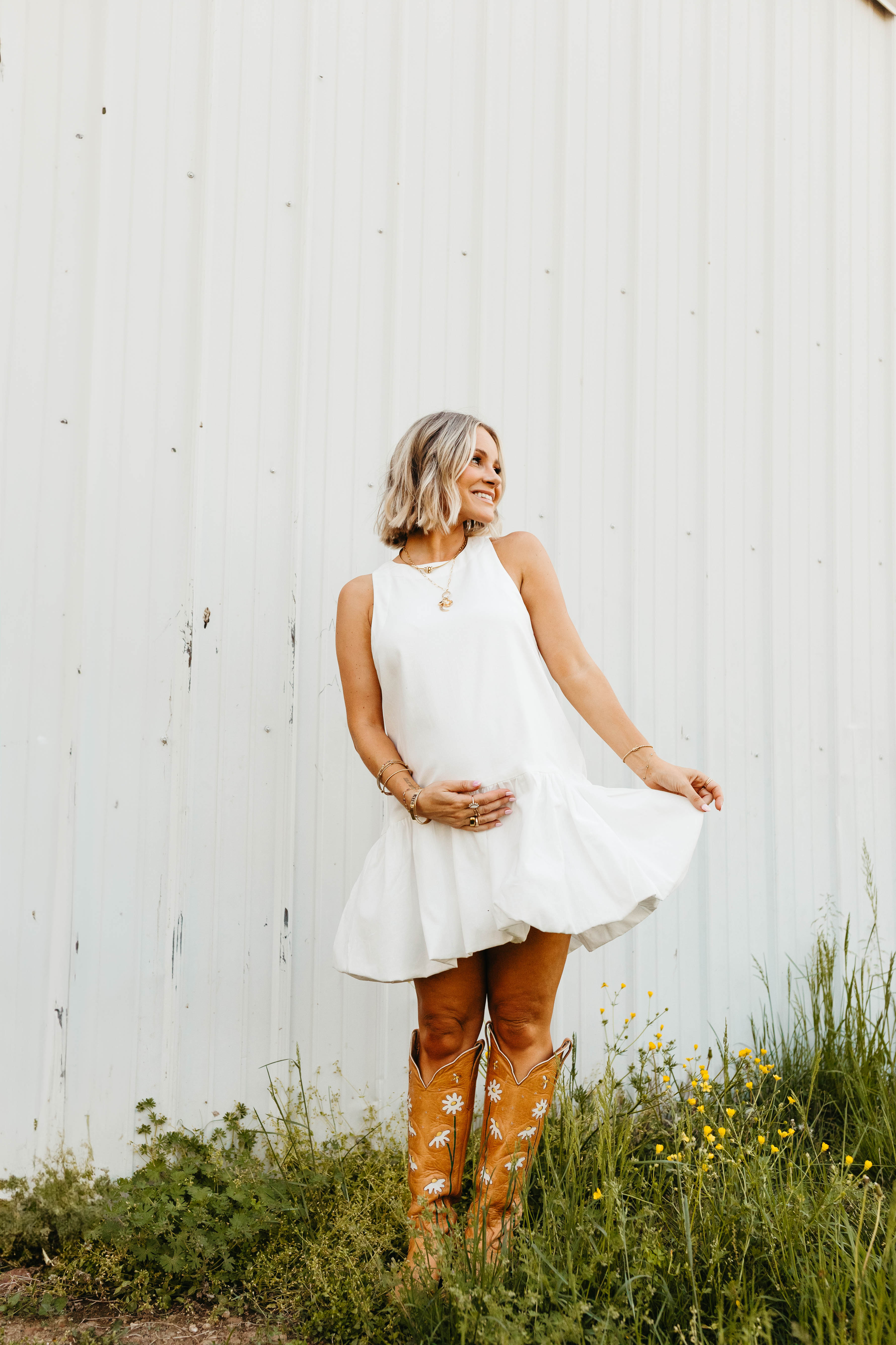 DETAILS Turn heads and make a statement in the Zurich Mini Dress in White. This ultra-chic piece features a timeless round neckline and a playful bubble hemline that adds just the right amount of volume to your look.